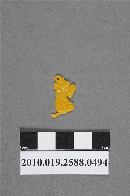 1.本物件為黃色猴子造型尪仔仙,為黃色塑膠材質。外型為猴子,呈立坐姿,咧嘴露出牙齒,左前足高舉,似做握手動作。頭頂兩耳間有圓形環及射出痕。物件覆滿點狀紋為毛皮狀,臀部有一區塊較為突起,後接尾巴。物件背面細部結構較明顯,可看出臉部表情及腿部曲起的樣子。本系列尪仔仙多為相同塑膠模版,僅有顏色不同,或是同色同塑膠模版等形式。