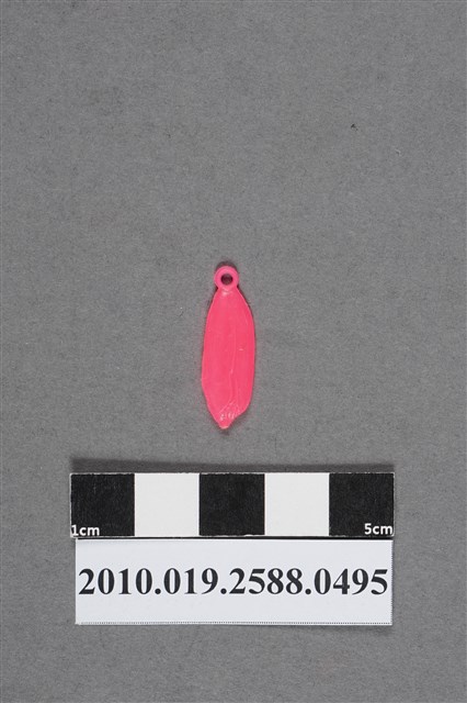1.本物件為玉米造型尪仔仙,為粉紅色塑膠材質。外型為玉米,頂端有一圓環,尾端做出玉米尖端數層外皮層層包覆的感覺。背面有數道痕跡,顯示為被外皮完整包覆的玉米。本系列尪仔仙多為相同塑膠模版,僅有顏色不同,或是同色同塑膠模版等形式。