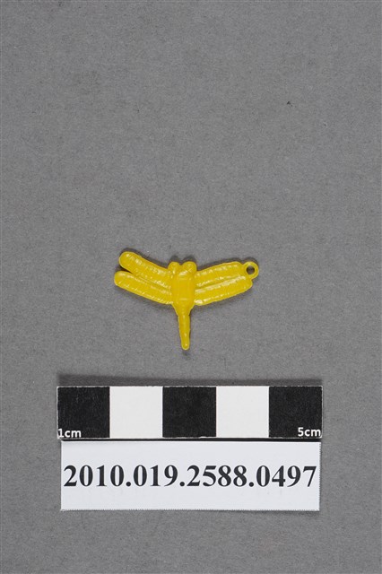 1.本物件為蜻蜓造型尪仔仙,為黃色塑膠材質。外型為蜻蜓,中間構造分為頭、胸、腹,頭部有一對複眼,胸部部位兩側共有兩對翅膀,上有直線擬做翅脈。右側下翅有射出痕,左側兩翅末端間有圓形環,有斷裂痕跡。物件反面結構大致與正面同,但眼睛部位各有一眼球,胸部部位有一方形框。本系列尪仔仙多為相同塑膠模版,僅有顏色不同,或是同色同塑膠模版等形式。