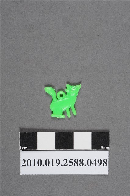 1.本物件為狐造型尪仔仙,為綠色塑膠材質。外型為狐,頭部微仰,可見眼睛,吻部及鼻端,似要跳躍的姿勢。背上有圓形環,後方為豎立的尾巴,末端澎大,邊緣有殘膠。後肢連在一起,隱約可見中間的分線,底部有射出痕。物件背面大致與正面同,但細部結構較不明顯。本系列尪仔仙多為相同塑膠模版,僅有顏色不同,或是同色同塑膠模版等形式。