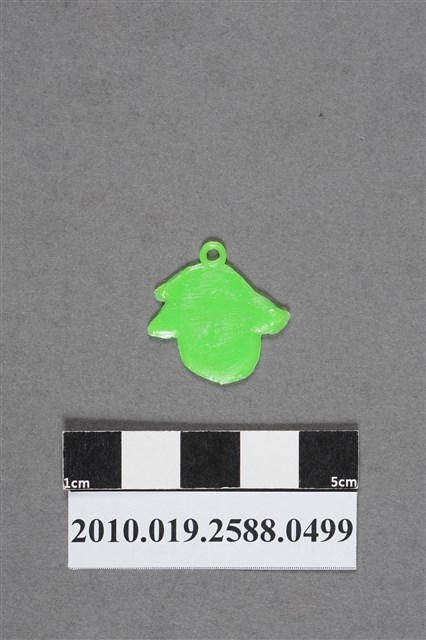 1.本物件為男性頭像造型尪仔仙,為綠色塑膠材質。外型為男性頭像,頭髮雜亂參差不齊,臉形渾圓,表情敦厚,頭頂有圓形環,下頷處有射出痕。物件背面無細部結構,有些微磨損痕跡。本系列尪仔仙多為相同塑膠模版,僅有顏色不同,或是同色同塑膠模版等形式。