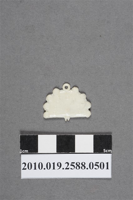 1.本物件為孔雀造型尪仔仙,為白色塑膠材質。外型為孔雀,扇狀部分為尾羽開屏狀,內有眼狀斑,右方有一磨損痕跡,雀屏上方有圓形環。孔雀主體並不明顯,僅能辨識出頭、脖子、身體與兩腳,眼及喙不明顯。物件背面為孔雀背面,可見雀屏及兩腳。本系列尪仔仙多為相同塑膠模版,僅有顏色不同,或是同色同塑膠模版等形式。