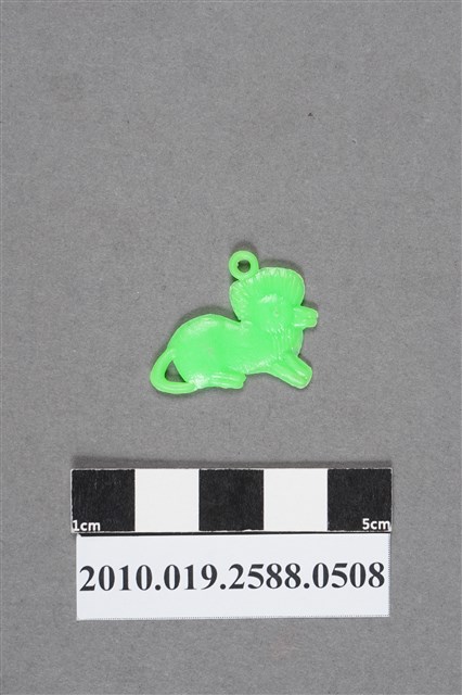 1.本物件為雄獅造型尪仔仙,為綠色塑膠材質。外型為獅,頭部圍有一圈鬃毛,為雄獅,鬃毛上方有圓形環,吻部較長,臉部細節不明顯。身體呈現趴姿,尾巴末端與後肢相連。物件背面與正面同,且均有磨損痕跡。本系列尪仔仙多為相同塑膠模版,僅有顏色不同,或是同色同塑膠模版等形式。