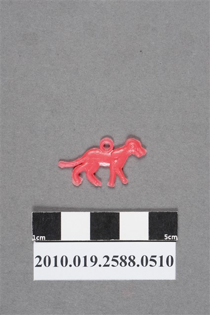 1.本物件為狗造型尪仔仙,為粉紅色塑膠材質。外型為狗,頭部有眼、嘴、耳等結構,但細節簡單。脖子部位戴有項圈,背部有圓形環,呈行走姿態,四肢末端有殘膠,尾巴角度平緩。物件背面與正面同。本系列尪仔仙多為相同塑膠模版,僅有顏色不同,或是同色同塑膠模版等形式。