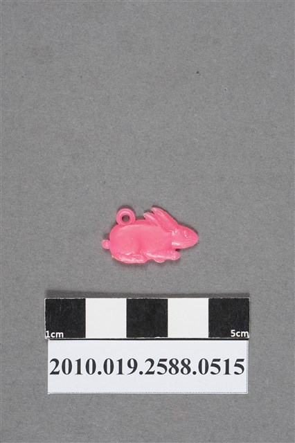1.本物件為兔造型尪仔仙,為粉紅色塑膠材質。外型為兔,四肢蜷縮成一團,長耳向後貼服,睜著大眼,背上有圓形環,臀部有球狀尾巴。物件背面大致與正面同,但頭部可見鬍鬚,耳朵形式也稍有不同。本系列尪仔仙多為相同塑膠模版,僅有顏色不同,或是同色同塑膠模版等形式。