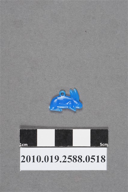 1.本物件為兔造型尪仔仙,為藍色塑膠材質。外型為兔,呈靜止不動狀,長耳豎直,睜著大眼,吻部有鬍鬚,背上有圓形環,臀部有射出痕。左側耳朵有一白色殘膠通過。物件背面大致與正面同,但頭部只有眼睛,不見鬍鬚構造,圓形環及長耳有明顯磨損痕跡。本系列尪仔仙多為相同塑膠模版,僅有顏色不同,或是同色同塑膠模版等形式。