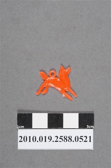 1.本物件為鹿造型尪仔仙,為橘色塑膠材質。外型為鹿,頭上無角,可能為雌鹿或幼鹿。姿勢為邊向前跳躍邊回頭,頭部有一對尖耳、眼睛及嘴,但眼睛及嘴的位置不甚正確,呈現不自然的狀態。背上有圓形環,臀部有尾,前肢有射出痕。物件背面平滑,無細部結構。本系列尪仔仙多為相同塑膠模版,僅有顏色不同,或是同色同塑膠模版等形式。