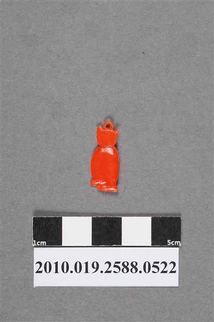 1.本物件為動物造型尪仔仙,為橘色塑膠材質。外型為動物,但無法確認辨識為何種動物。頭部有一對小耳,無辜大眼及大而扁平的鼻子,頭頂有圓形環。身體上方部有兩隻小手,似垂放在腿上,身體最下方似為腳掌,左側腳掌有射出痕。物件背面有磨痕,無細部結構。本系列尪仔仙多為相同塑膠模版,僅有顏色不同,或是同色同塑膠模版等形式。