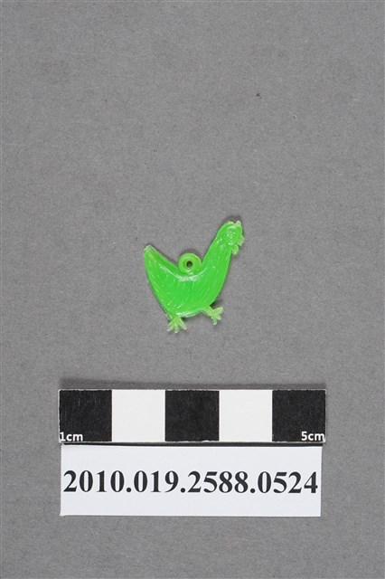 1.本物件為雞造型尪仔仙,為綠色塑膠材質。外型為雞,頭頂無法判斷原有為雞冠或射出痕。雞喙下有肉垂,身上以線條呈現羽毛,背上有圓形環。物件背面與正面同,但身體線條呈現方式不同。本系列尪仔仙多為相同塑膠模版,僅有顏色不同,或是同色同塑膠模版等形式。