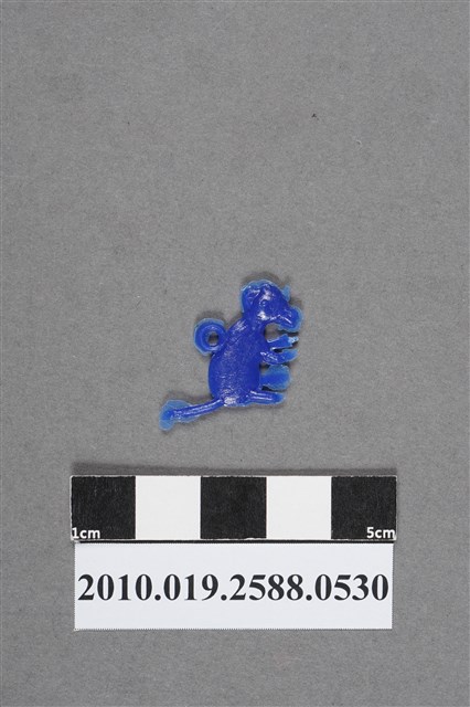 1.本物件為鼠造型尪仔仙,為藍色塑膠材質。外型為鼠,頭部有眼睛,不明顯之小耳構造,嘴部構造突出,不似鼠吻。背上有圓形環,前肢與兩後肢連接於身體處較突出部分,為肌肉較達發處,身體末端有尾巴。物件邊緣有多處殘膠。物件背面與正面同,但較平滑,不像正面有做出肌肉發達處。物件正反面均有明顯磨痕。本系列尪仔仙多為相同塑膠模版,僅有顏色不同,或是同色同塑膠模版等形式。
