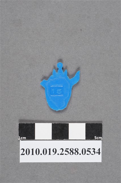 1.本物件為人物頭像造型尪仔仙,為藍色塑膠材質。外型為人物頭像,頭頂皇冠,有雲狀紋,有部分白色毀損痕跡,頂端有圓形環,但中間薄膜並未去除。頭上有兩支螺旋造型的角,右側角已斷裂。人物臉部覆蓋岩石狀紋路,像是戴面具般露出五宮。下頷處有射出痕及殘膠。物件背面平滑,有一圈白色磨痕,中有一方框,內有「15」字樣。本系列尪仔仙多為相同塑膠模版,僅有顏色不同,或是同色同塑膠模版等形式。