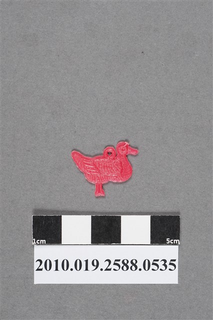 1.本物件為鴨造型尪仔仙,為紅色塑膠材質。外型為鴨,喙為扁平狀,額前有射出痕,全物件覆滿點狀紋以示羽毛。翅膀上方有圓形環,身體下方兩腳並攏,足底似有殘膠。物件背面的頭部可見一明顯柱狀射出痕跡。本系列尪仔仙多為相同塑膠模版,僅有顏色不同,或是同色同塑膠模版等形式。