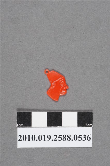 1.本物件為男性頭像造型尪仔仙,為橘色塑膠材質。外型為男性頭像,為側面,頭戴似宋谷帽的帽子,帽子頂端有圓形環,後腦帽緣露出些微頭髮。男子目視前方,頰上的法令紋暗示其為年齡稍長之男性。物件背面與正面的表情有些微不同。本系列尪仔仙多為相同塑膠模版,僅有顏色不同,或是同色同塑膠模版等形式。
