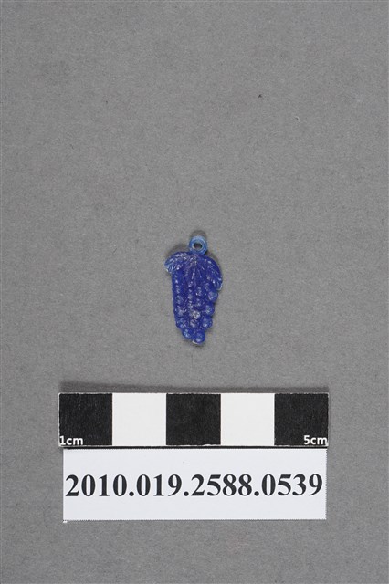 1.本物件為葡萄造型尪仔仙,為藍色塑膠材質。外型為葡萄,三片葡萄葉上方為圓形環,葉片下方有四串葡萄,以凹凸做出顆粒感。物件背面與正面同,但中間的葡萄有較嚴重的磨損痕跡。本系列尪仔仙多為相同塑膠模版,僅有顏色不同,或是同色同塑膠模版等形式。