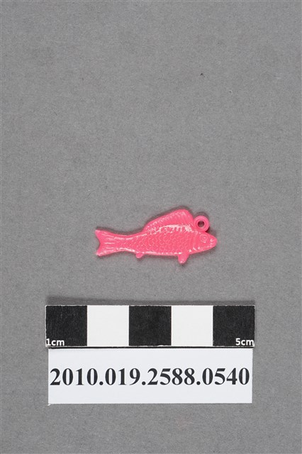 1.本物件為魚造型尪仔仙,為粉紅色塑膠材質。外型為魚,魚頭的眼及嘴構造明顯,額上有圓形環。魚身飾有魚鱗,背上有大片背鰭,身體下方有腹鰭及臀鰭,尾鰭下端有斷損痕跡。物件背面與正面同。本系列尪仔仙多為相同塑膠模版,僅有顏色不同,或是同色同塑膠模版等形式。