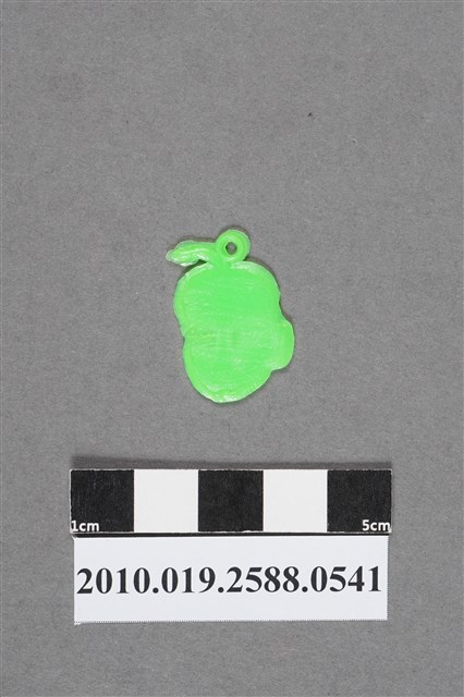 1.本物件為二齒頭像造型尪仔仙,為綠色塑膠材質。外型為二齒。頭上有一圓形環,環邊有一小摱頭髮,邊緣有殘膠。五官最為明顯的是兩顆突出的門齒。物件背面平滑無細部結構。本系列尪仔仙多為相同塑膠模版,僅有顏色不同,或是同色同塑膠模版等形式。
