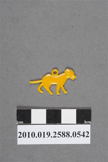 1.本物件為狗造型尪仔仙,為黃色塑膠材質。外型為狗,頭部耳朵結構不明顯,頭部與嘴巴間有殘膠。背部有圓形環,四肢著地做行走姿勢,前肢末端有殘膠,尾巴平舉。物件背面與正面同。本系列尪仔仙多為相同塑膠模版,僅有顏色不同,或是同色同塑膠模版等形式。