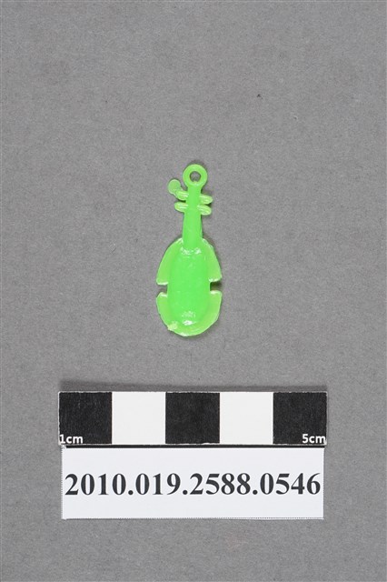 1.本物件為小提琴造型尪仔仙,為綠色塑膠材質。外型為小提琴,僅做出基本形狀及最上方的弦軸、指板、琴身等三項構造,無琴頭、琴弦或音孔等細部結構。物件頂端有圓形環,第一道弦軸右側有殘膠。物件背面的琴身左下角有射出痕。本系列尪仔仙多為相同塑膠模版,僅有顏色不同,或是同色同塑膠模版等形式。