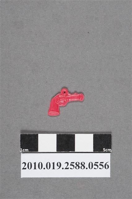 1.本物件為轉輪手槍造型尪仔仙,為紅色塑膠材質。外型為轉輪手槍,基本結構包含槍管、準星、彈筒、扳機、護弓及握柄的部分均有做出,彈筒上方有圓形環。物件背面與正面同,雙面均有磨損痕跡。本系列尪仔仙多為相同塑膠模版,僅有顏色不同,或是同色同塑膠模版等形式。