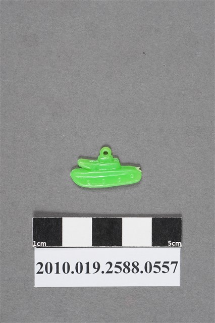 1.本物件為戰車造型尪仔仙,為綠色塑膠材質。外型為戰車,炮塔右側為炮管,炮塔上有炮塔門及圓環。履帶結構簡化,並無細分動輪與路輪,履帶左側有射出痕。物件背面的履帶內車輪與正面的並不對稱。本系列尪仔仙多為相同塑膠模版,僅有顏色不同,或是同色同塑膠模版等形式。