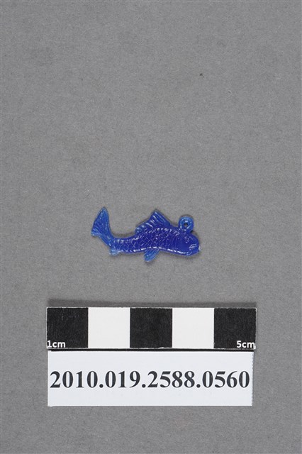 1.本物件為魚造型尪仔仙,為藍色塑膠材質。外型為魚,為正在游動的姿態。魚身有鱗片,魚身上方有山形背鰭,魚頭上方有圓形環,魚嘴處有射出痕。魚身下方有腹鰭及臀鰭,尾鰭上翹。物件背面魚頭下頷處較正面為方正。本系列尪仔仙多為相同塑膠模版,僅有顏色不同,或是同色同塑膠模版等形式。