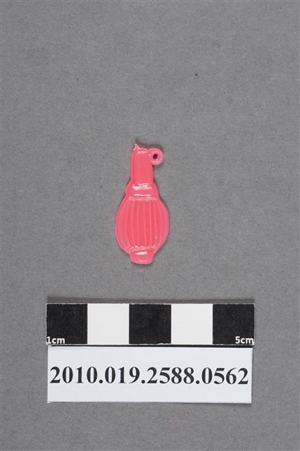 1.本物件為螺造型尪仔仙,為粉紅色塑膠材質。外型為螺,為俯視角度,前端為螺首,末端有射出痕,左側有圓環,中間為螺殼,有直紋凹凸痕,尾端為斧足。物件背面與正面同。本系列尪仔仙多為相同塑膠模版,僅有顏色不同,或是同色同塑膠模版等形式。