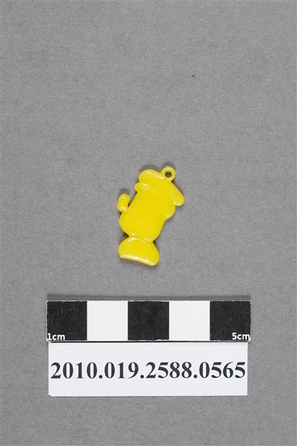 1.本物件為大力水手尪仔仙,為黃色塑膠材質。外型為大力水手,頭上戴海軍帽,帽頂有圓形環。五官表情嚴肅,嘴裡叼著煙斗。頭部下方部分應為V領海軍服,右下方有射出痕。物件背面無細部結構,雙面均保持完整,無磨損情況。本系列尪仔仙多為相同塑膠模版,僅有顏色不同,或是同色同塑膠模版等形式。