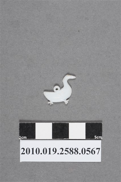 1.本物件為鵝造型尪仔仙,為白色塑膠材質。外型為鵝,為正在行走的姿勢,嘴喙較尖,身形圓長,身上有數道曲線繪出翅膀,背上有圓環。物件背面的頭上有污損痕跡,翅膀繪製方向與正面同,造成倒錯情況。本系列尪仔仙多為相同塑膠模版,僅有顏色不同,或是同色同塑膠模版等形式。