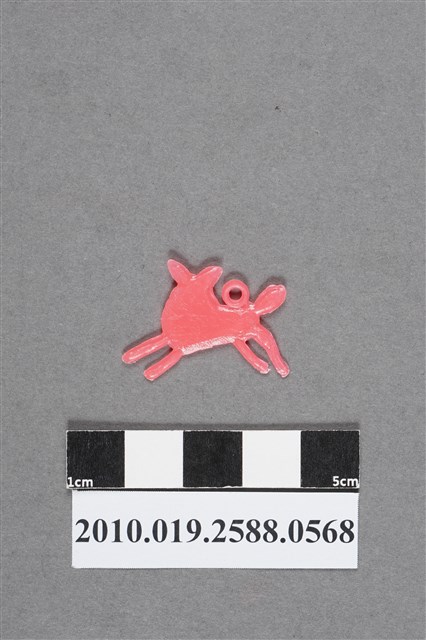 1.本物件為鹿造型尪仔仙,為粉紅色塑膠材質。外型為鹿,頭上無角,可能為雌鹿或幼鹿。姿勢為邊向前跳躍邊回頭,頭部有一對尖耳、眼睛及嘴,但兩眼的位置不甚正確,呈現不自然的狀態。背上近臀部有圓形環,臀部有尾巴,大小亦不甚合理,腹部有射出痕,後足有射出痕及殘膠。物件背面平整,無細部結構。本系列尪仔仙多為相同塑膠模版,僅有顏色不同,或是同色同塑膠模版等形式。