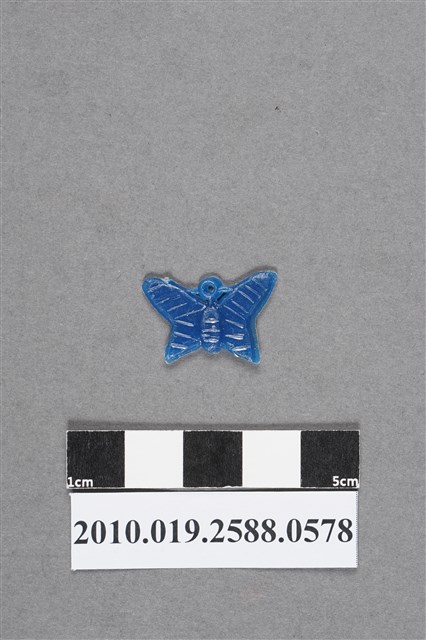 1.本物件為蝴蝶造型尪仔仙,為藍色塑膠材質。外型為蝴蝶,兩側翅膀飾以斜橫線條紋,身體頂端有一圓形環,環上兩側有類觸鬚狀物與兩側翅膀連接,右側上翅上緣有射出痕。物件背面翅膀紋路完整,均飾以斜橫紋,紋路不像物件正面密集,翅膀邊緣有磨損痕跡。本系列尪仔仙多為相同塑膠模版,僅有顏色不同,或是同色同塑膠模版等形式。