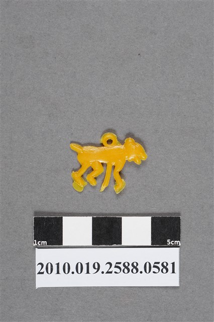 1.本物件為狗造型尪仔仙,為黃色塑膠材質。外型為狗,頭部有眼及小耳,背部有圓環,臀部有短尾。四肢動作不甚協調,無法辨識為何種動作,後肢構造較偏向人足。物件背面與正面同,且邊緣有多處殘膠。本系列尪仔仙多為相同塑膠模版,僅有顏色不同,或是同色同塑膠模版等形式。