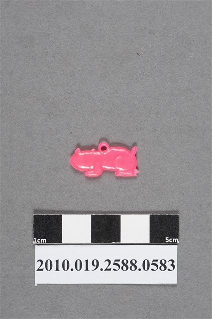 1.本物件為貓造型尪仔仙,為粉紅色塑膠材質。外型為貓,呈趴姿,頭部可見豎立的耳朵、眼睛、鼻子、嘴邊及鬍鬚等細節,脖子隱約可見項圈。背部上方有圓形環,後肢關節末端有射出痕。臀部有短短的尾巴。物件背面為貓的背面,有些磨痕。本系列尪仔仙多為相同塑膠模版,僅有顏色不同,或是同色同塑膠模版等形式。