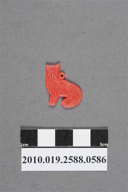 1.本物件為貓造型尪仔仙,為紅色塑膠材質。外型為貓,呈立坐姿,頭部稍作回首狀,有眼睛及鬍鬚。頭部兩耳間有射出痕痕跡,左側與背部交接處有圓形環。前腳直立,後腳被尾巴環繞,身上有許多凹凸線條。物件背面以隨意交錯的線條表示毛髮,線條及物件邊緣均呈白色磨損痕跡。本系列尪仔仙多為相同塑膠模版,僅有顏色不同,或是同色同塑膠模版等形式。