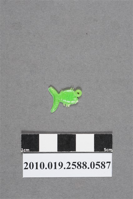 1.本物件為魚造型尪仔仙,為綠色塑膠材質。外型為魚,魚頭前端有圓形環,魚嘴張開,下唇較上唇突出,下頷處有射出痕。魚身有凹凸條紋,上、下方有數個突起物,不知是否為因射出不良而未成形的鰭部,尾鰭短而寬,上有短條紋。物件背面的頭部表情較正面猙獰,眼睛也離圓環較近。本系列尪仔仙多為相同塑膠模版,僅有顏色不同,或是同色同塑膠模版等形式。