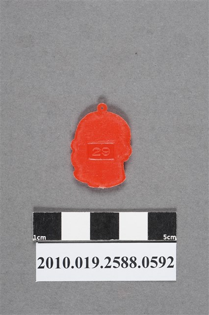 1.本物件為人物頭像造型尪仔仙,為紅色塑膠材質。外型為人物頭像,耳朵部分有一圓球,延伸出頭盔,頭頂有圓環。人物眼神無神,闊嘴中有獠牙,嘴邊有放射狀似裸露的肌肉結構,後頸粗壯。物件背面平整,中有一方框,內有「29」字樣,有泛白磨痕。本系列尪仔仙多為相同塑膠模版,僅有顏色不同,或是同色同塑膠模版等形式。