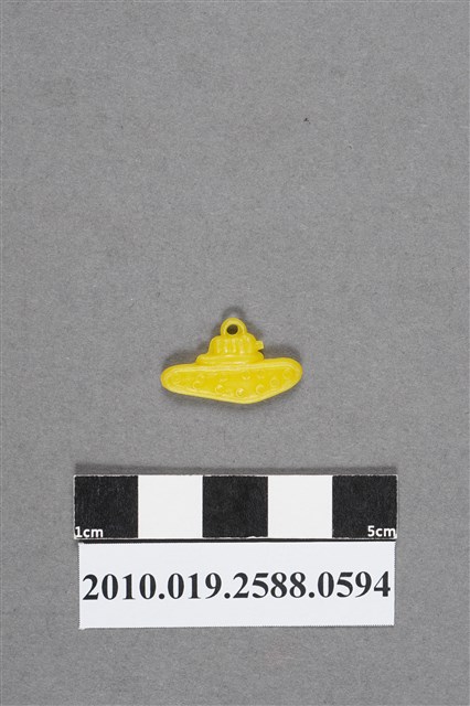 1.本物件為戰車造型尪仔仙,為黃色塑膠材質。外型為戰車,炮塔飾以凹凸狀,左側為炮管,已斷裂,末端有整齊的斷痕,上有圓環。履帶呈倒倒三角形,結構簡化無細分動輪與路輪,以同樣大小的圓圈表示履帶內的鋼輪。物件背面的鋼輪與正面相較較不平整。本系列尪仔仙多為相同塑膠模版,僅有顏色不同,或是同色同塑膠模版等形式。