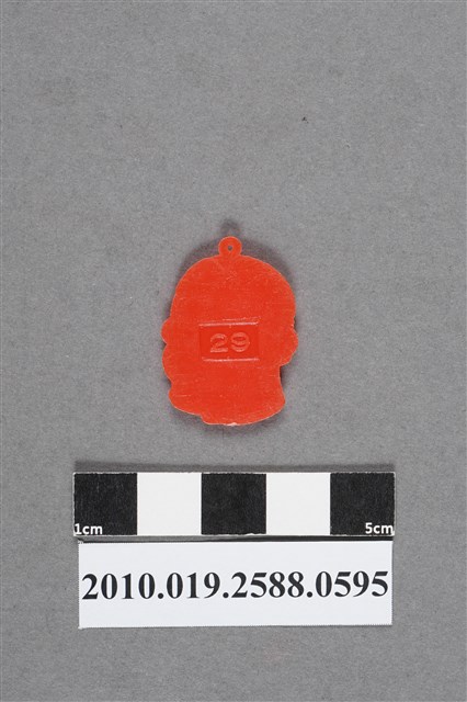 1.本物件為人物頭像造型尪仔仙,為紅色塑膠材質。外型為人物頭像,耳朵部分有一圓球,延伸出頭盔,頭頂有圓環。人物眼神無神,闊嘴中有獠牙,嘴邊有放射狀似裸露的肌肉結構,後頸粗壯。物件背面平整有磨痕,中有一方框,內有「29」字樣。本系列尪仔仙多為相同塑膠模版,僅有顏色不同,或是同色同塑膠模版等形式。