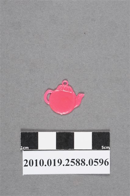1.本物件為茶壺造型尪仔仙,為粉紅色塑膠材質。外型為茶壺,形狀似橘形,壺蓋飾以直紋,上方有圓形環。壺身平整光滑,左側為壺嘴,右側為把手,壺底有射出痕。物件背面較正面感覺歪斜,壺蓋與壺身不太協調。本系列尪仔仙多為相同塑膠模版,僅有顏色不同,或是同色同塑膠模版等形式。