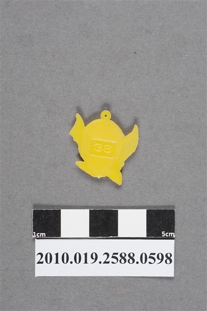1.本物件為水妖頭像造型尪仔仙,為黃色塑膠材質。外型為水妖頭像,頭頂有圓環,耳部為兩道鰓,額間有一點,口中露出兩支獠牙,面目猙獰,下方有射出痕。物件背面平整,有一方框,內有數字「38」字樣。本系列尪仔仙多為相同塑膠模版,僅有顏色不同,或是同色同塑膠模版等形式。