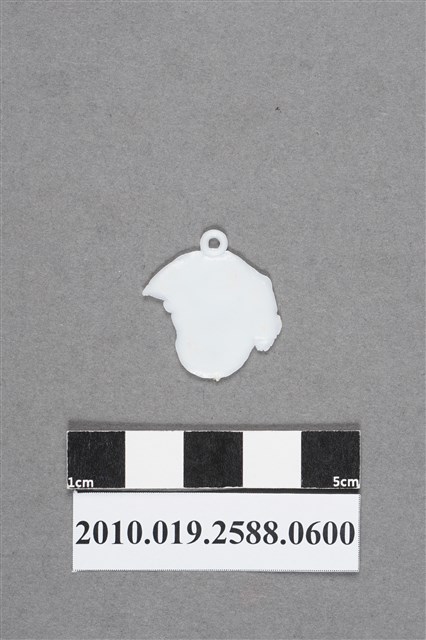 1.本物件為男性頭像造型尪仔仙,為白色塑膠材質。外型為一男性頭像,頭帶儒巾,儒巾上方有一圓環。男子表情嚴肅,凝視前方,下頷處有射出痕。物件背面平整無細部結構。本系列尪仔仙多為相同塑膠模版,僅有顏色不同,或是同色同塑膠模版等形式。
