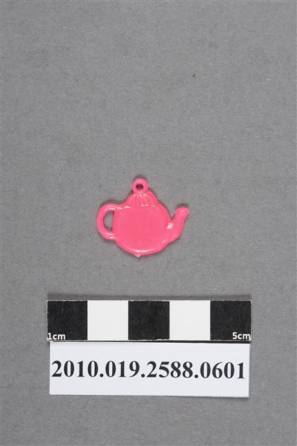 1.本物件為茶壺造型尪仔仙,為粉紅色塑膠材質。外型為茶壺,形狀似橘形,壺蓋飾以放射紋,上方有圓環,有些歪斜。壺身左側為壺嘴,右側為把手,壺底有射出痕。物件雙面均有明顯磨損痕跡。本系列尪仔仙多為相同塑膠模版,僅有顏色不同,或是同色同塑膠模版等形式。