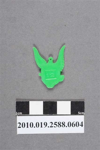 1.本物件為人物頭像造型尪仔仙,為綠色塑膠材質。外型為妖怪,頭上有兩隻螺旋狀長角,兩角近底處各有一圓圈,似為裝飾,頭頂有圓環,臉頰削瘦,為兔形嘴,展耳,右側耳朵不完整。物件背面平整,中有一方框,內有「12」字樣,有些微磨損痕跡。本系列尪仔仙多為相同塑膠模版,僅有顏色不同,或是同色同塑膠模版等形式。