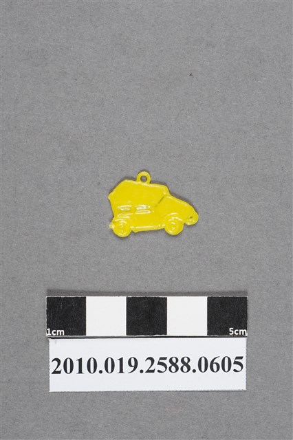 1.本物件為車造型尪仔仙,為黃色塑膠材質。外型為車,車形方正,車頂上方有圓形環,後方及後輪處有射出痕。引擎蓋飾有橫紋至盡頭為半圓形保險桿。車身有兩面車窗,並無做出車門形狀,正面擋風玻璃處有凹陷感。物件背面隱約可見正面結構。本系列尪仔仙多為相同塑膠模版,僅有顏色不同,或是同色同塑膠模版等形式。