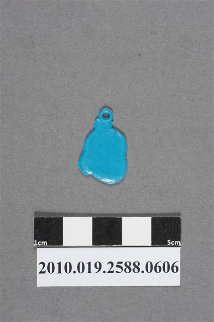 1.本物件為人物頭像造型尪仔仙,為藍色塑膠材質。外型為人物頭像,應為男子,將頭髮梳成髮髻,髻上有圓形環。男子臉頰豐滿,鼻樑及右耳有明顯磨損痕跡,下頷處有射出痕。物件背面平整無細部結構,有磨損痕跡。本系列尪仔仙多為相同塑膠模版,僅有顏色不同,或是同色同塑膠模版等形式。