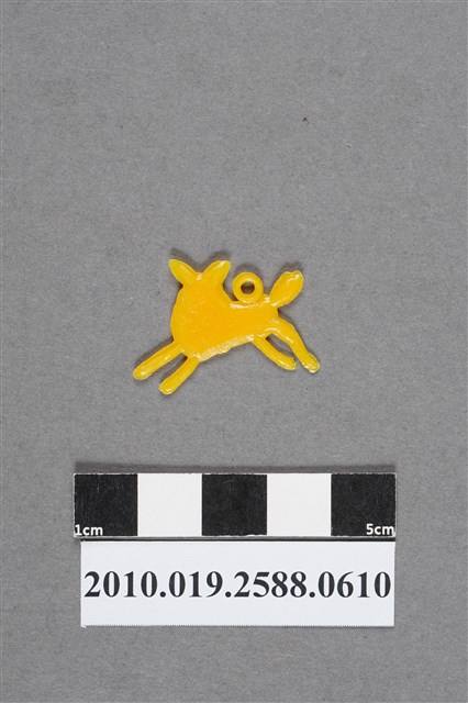 1.本物件為鹿造型尪仔仙,為黃色塑膠材質。外型為鹿,因頭上無角,可能為雌鹿或幼鹿。姿勢為邊向前跳躍邊回頭,頭部有一對尖耳、眼睛及嘴,但眼睛及嘴的位置並不正確。背上有圓形環,臀部有尾,腹部有射出痕,四肢末端均有殘膠。物件背面平整,無細部結構。本系列尪仔仙多為相同塑膠模版,僅有顏色不同,或是同色同塑膠模版等形式。