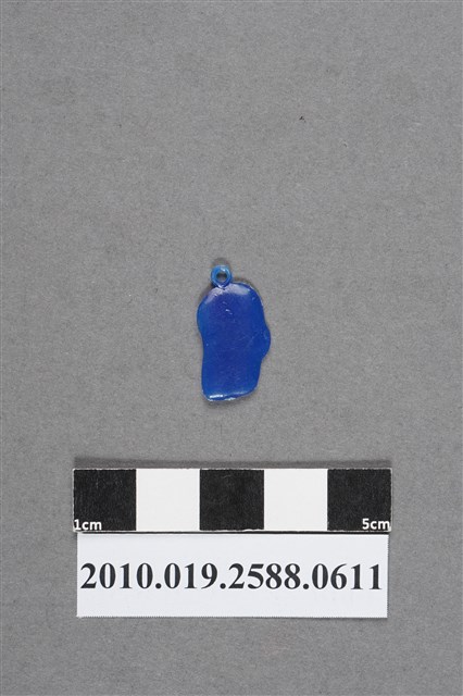1.本物件為男性頭像造型尪仔仙,為藍色塑膠材質。外型為男性頭像,額前有三撮瀏海,眉毛與眼睛距離大,面露微笑,營造出詼諧趣味的感覺。頭頂有圓環,右側鼻翼有白色磨痕,下頷處有射出痕及磨損痕跡。物件背面平整無細部結構,有磨損痕跡。本系列尪仔仙多為相同塑膠模版,僅有顏色不同,或是同色同塑膠模版等形式。