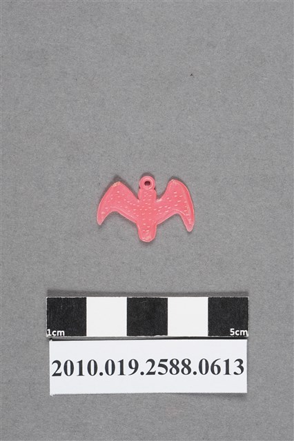 1.本物件為鳥造型尪仔仙,為粉紅色塑膠材質。外型為鳥,眼睛於臉部兩側,中間為鳥喙,兩翅呈張開狀,翅膀綴以許多短橫紋。頭部有圓環,右側翅膀有射出痕,身體中央有王字白痕。物件背面為鳥類背部,飾有許多橫紋呈現羽毛狀。本系列尪仔仙多為相同塑膠模版,僅有顏色不同,或是同色同塑膠模版等形式。