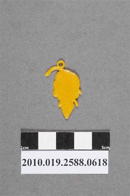 1.本物件為怪老子造型尪仔仙,為黃色塑膠材質。外型為怪老子頭像,頭頂紮一髮辮,末端有些殘膠,辮上有圓環。眉頭微皺,嘴邊蓄有長鬍,末端有射出痕。物件背面平整無細部結構,有些微磨損痕跡。本系列尪仔仙多為相同塑膠模版,僅有顏色不同,或是同色同塑膠模版等形式。