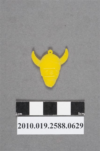 1.本物件為人物頭像造型尪仔仙,為黃色塑膠材質。外型為人物頭像,頭戴有角狀物裝飾的頭盔,額頭部位有兩排點狀裝飾,頂端有圓環。五官立體,兩眼炯炯有神,咧嘴微笑。下頷處有射出痕。物件背面平整,中有方框,內有「18」字樣,有些微磨痕。本系列尪仔仙多為相同塑膠模版,僅有顏色不同,或是同色同塑膠模版等形式。