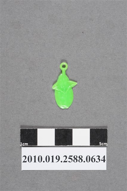 1.本物件為石榴造型尪仔仙,為綠色塑膠材質。外型為石榴,左右兩側做出剝離本體一半的外殼,中間的主體做出顆粒感覺。頂端有一圓環,末端有射出痕。物件背面與正面同。本系列尪仔仙多為相同塑膠模版,僅有顏色不同,或是同色同塑膠模版等形式。